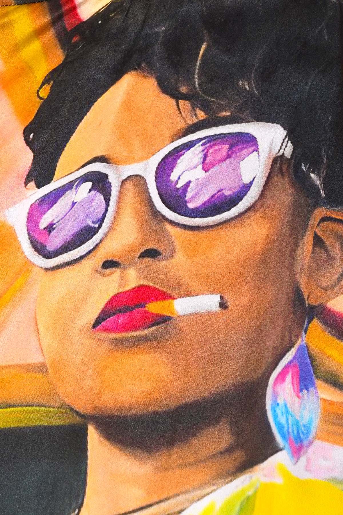 Le motif de ce kimono est inspiré de Embassada, une peinture originale de l’artiste contemporaine Aurélie Quentin, connue pour ses portraits figuratifs imprégnés de scènes de vie, d’ambiances vibrantes et d’une esthétique singulière mêlant humour et intensité visuelle.