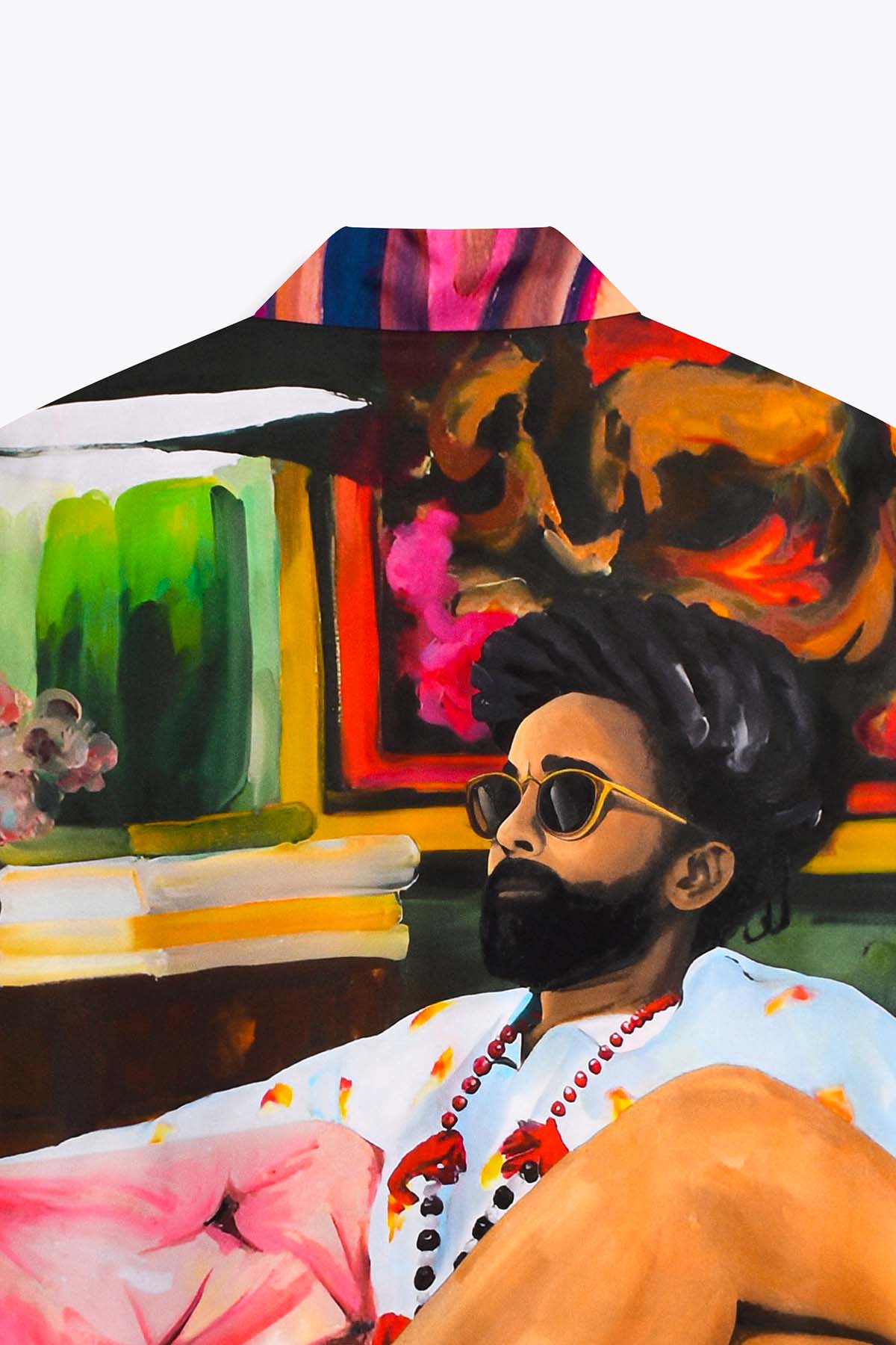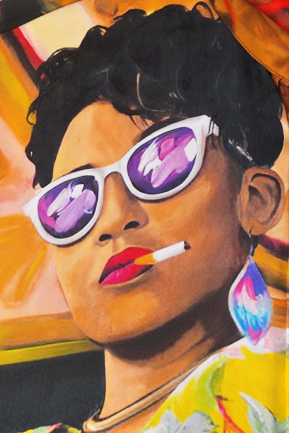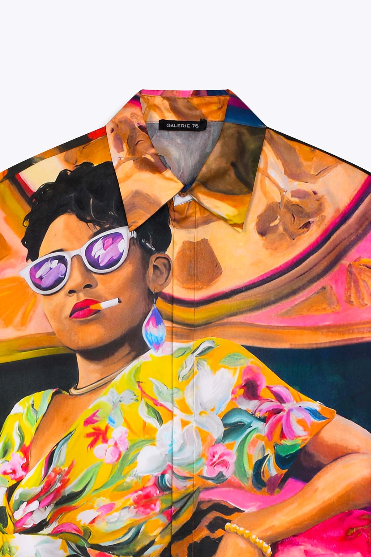 Cette chemise homme manches longues en soie est sublimée par une impression inspirée de Embassada, une œuvre originale d’Aurélie Quentin, artiste peintre contemporaine originaire de La Réunion, reconnue pour ses portraits figuratifs vibrants et ses scènes de vie riches en caractère. La soie naturelle apporte fluidité et éclat à cette pièce artistique forte.